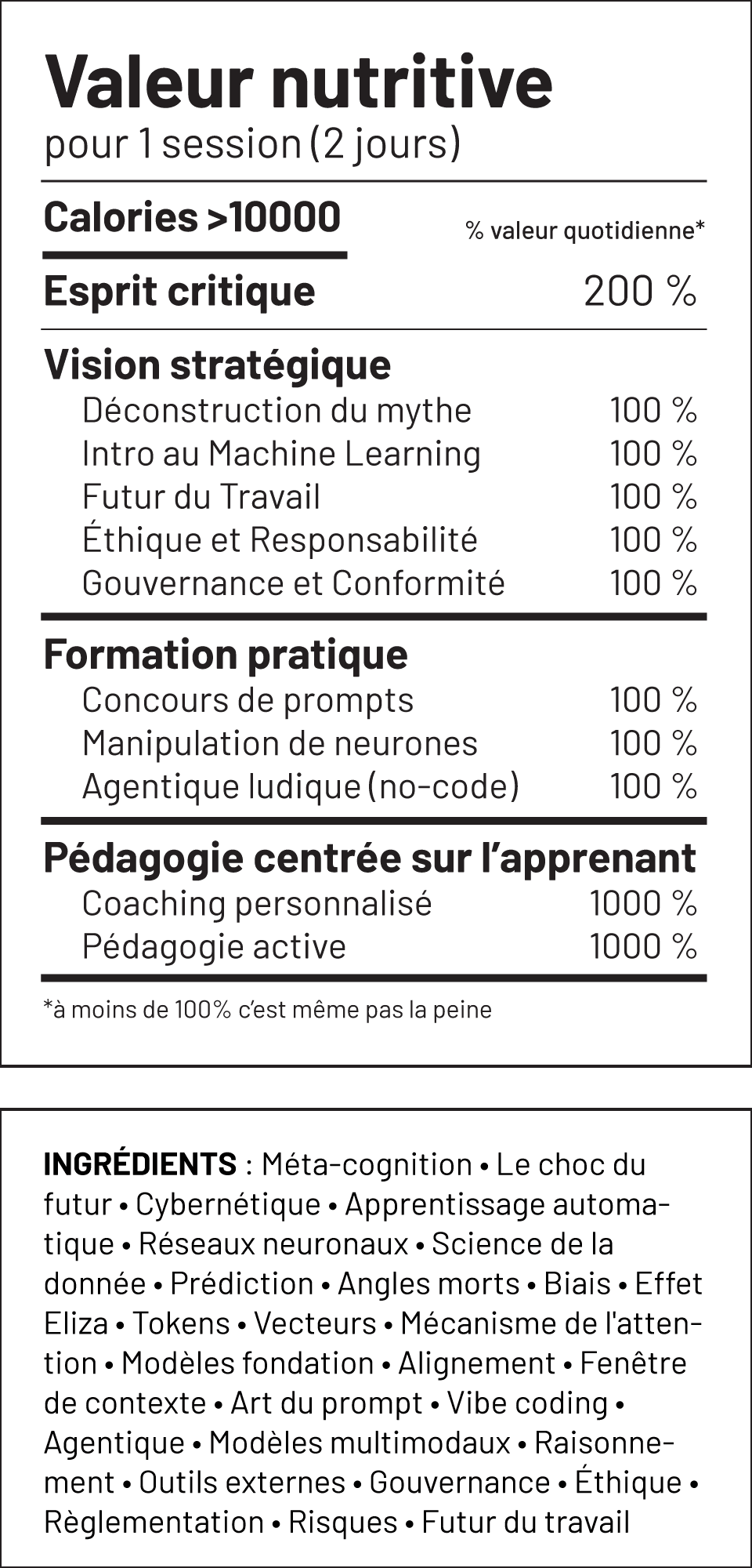 Le machine learning marque une rupture conceptuelle, quasi-philosophique ● Une formation standard à l'IA ne suffit pas ● Pour vous faire monter en compétences, il vous faut un professionnel de la compétence, pas de l'IA ● Il vous faut une pédagogie active, pas des slides ● Il vous faut un accompagnement dans la durée, pas juste un powerpoint Qualiopi.